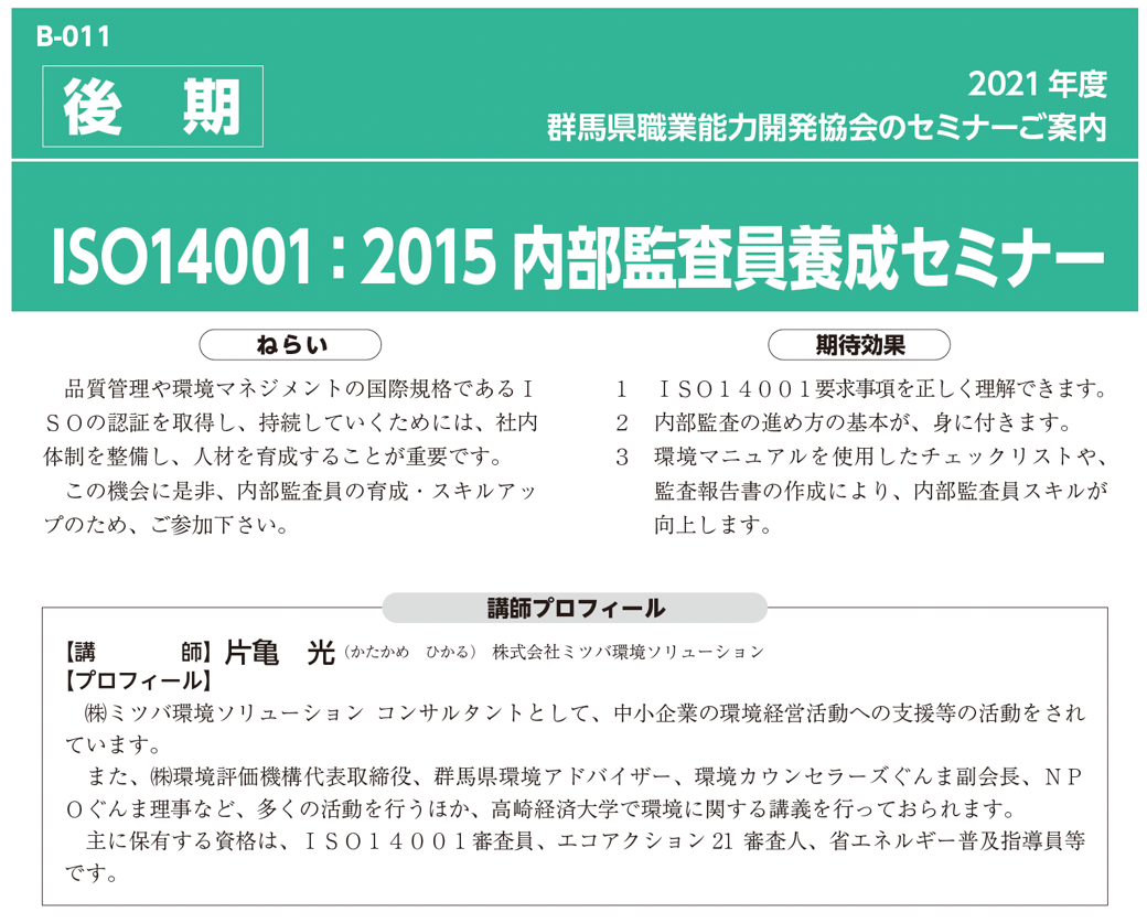 ISO14001:2015 内部監査員養成セミナー
