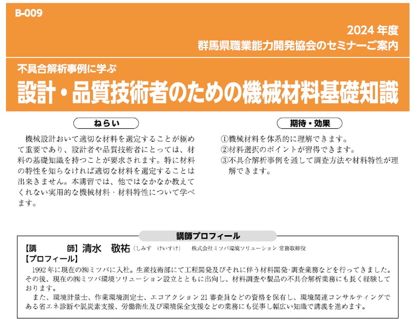 機械設計おいて適切な材料を最定することが極めて重要であり、設者や品質技術者にとっては、材料の基礎知識を持っことが要求されます。特に材料の特性を知らなければ適切な材料を選定することは出来きません。本講習では、他ではなかなか教えて