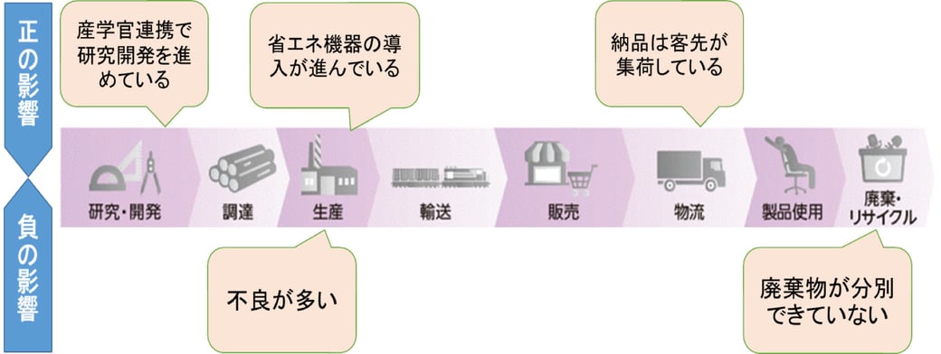 材料の調達~サプライヤー~設備~操業~廃棄などの主たる工程に対し、「正の影響」「負の影響」を考える。