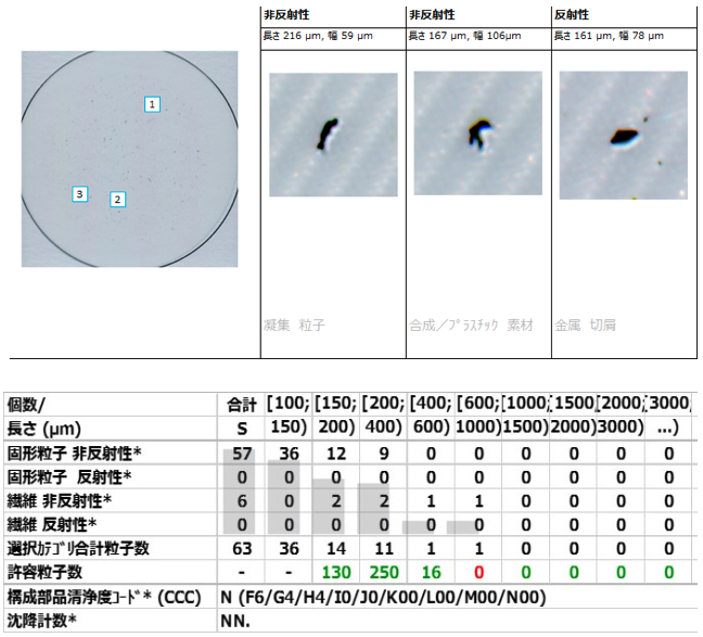 フィルタ上の粒子サイズ、個数、形状、分類を解析可能です。
